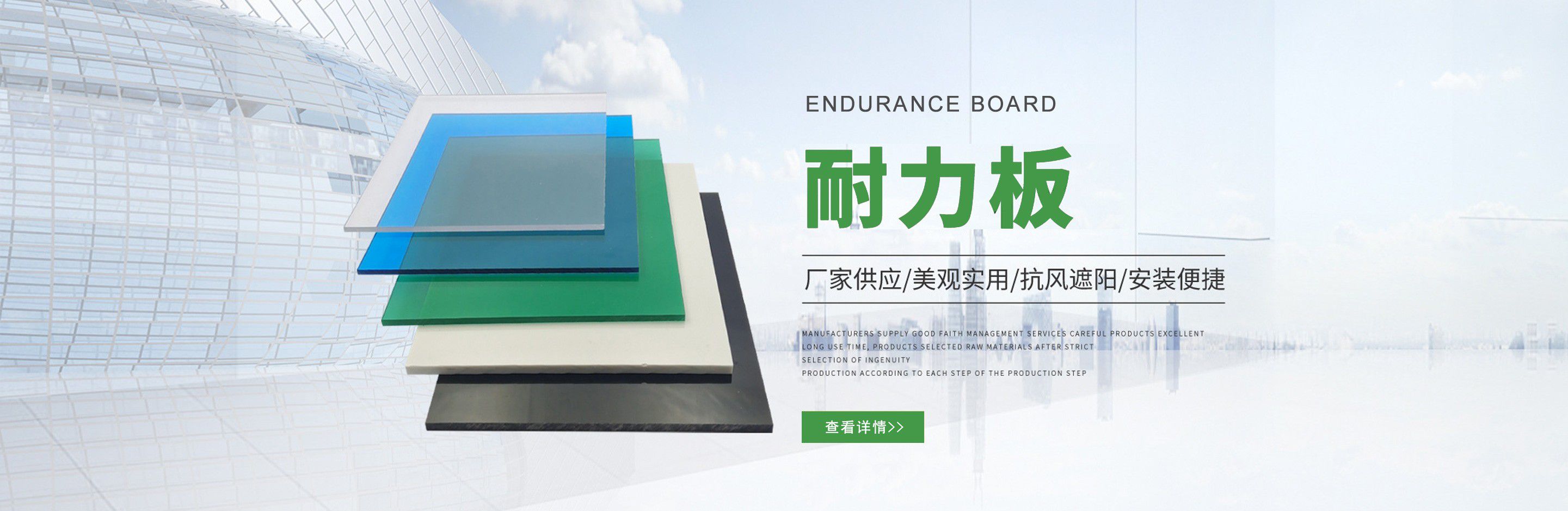 聊城市沐金塑膠有限公司注冊資金2180萬元,占地20000余平方,擁有自建廠房15000平方,員工100余名。10余年來,公司主營耐力板,鎖扣耐力板,耐力板深加工,無動力通風(fēng)器,組合雨搭,PVC硬脂板,耐力板廠家等板材的發(fā)展戰(zhàn)略,逐漸成長為綜合性企業(yè)。 公司擁有多條板材共擠生產(chǎn)線,采用世界知名品牌進(jìn)口原材料和先進(jìn)工藝,依據(jù)完善的ISO9001質(zhì)量管理體系和ISO14001環(huán)境管理體系,為產(chǎn)品的卓越品質(zhì)提供了強(qiáng)有力的保證。憑借過硬的創(chuàng)新能力和堅實的硬件基礎(chǔ),贏創(chuàng)已成為國內(nèi)領(lǐng)先的熱塑性板材生產(chǎn)商,產(chǎn)品被廣泛應(yīng)用于建筑業(yè)、農(nóng)業(yè)、工業(yè)、廣告業(yè)、安防行業(yè)及DIY領(lǐng)域。 公司始終致力于通過提供最優(yōu)的板材應(yīng)用解決方案,為客戶創(chuàng)造最高的價值;堅守創(chuàng)新、質(zhì)量、靈活、服務(wù)和速度的核心價值觀;堅持“完美的產(chǎn)品需要完美服務(wù)的支持”的經(jīng)營理念,努力實現(xiàn)成為世界領(lǐng)先的板材與解決方案供應(yīng)商的夢想。 在未來,公司將立足客戶需求,不斷改變和完善現(xiàn)有產(chǎn)品,拓展產(chǎn)品線和充分開發(fā)板材的應(yīng)用領(lǐng)域,為客戶創(chuàng)造全方位的價值。同時更好地實現(xiàn)員工的價值,實現(xiàn)公司團(tuán)隊的價值。我們將與您一起創(chuàng)贏未來! 企業(yè)使命:成為世界領(lǐng)先的板材與解決方案供應(yīng)商。 公司愿景:通過提供最優(yōu)的板材應(yīng)用解決方案,為客戶創(chuàng)造最高的價值。 核心價值觀:質(zhì)量...